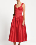 Vestido midi con tirantes gruesos, top estilo corset y lazos ajustables en la parte posterior. Falda ancha y largo medio.